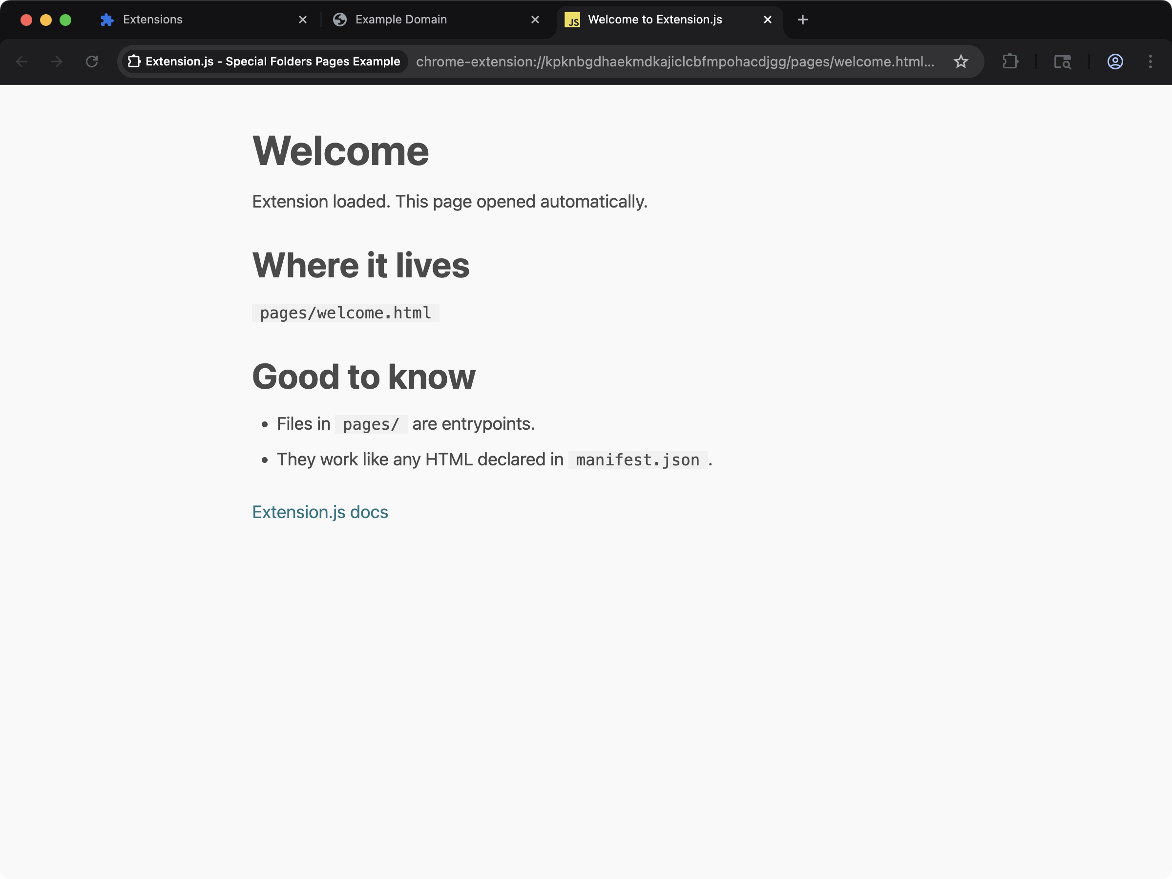 Many extension files are not declared directly in the manifest: iframe pages, scripts injected with scripting.executeScript, static vendor assets, and companion extensions used in development. Special folders make these first-class in the build pipeline.